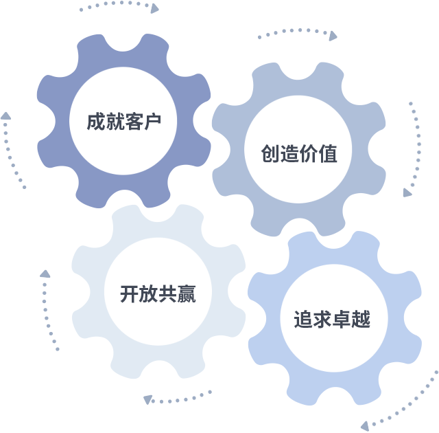 成就客户是一切决策的出发点,创造价值是衡量所有工作的标准,追求卓越是mg4355vip检测中心做事做人的态度,开放共赢是mg4355vip检测中心的格局也是最终的结果。价值观的齿轮环环相扣,推动着组织里的每个人不断向前。